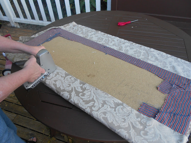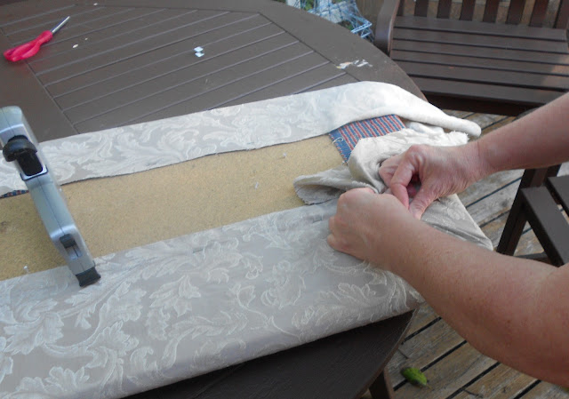 Going around the corners of the of the seat was a little trickier, but you just have to pull the fabric taunt and then staple it down. I didn't remove the very first layer of fabric, but it didn't interfere with stapling the new fabric on.